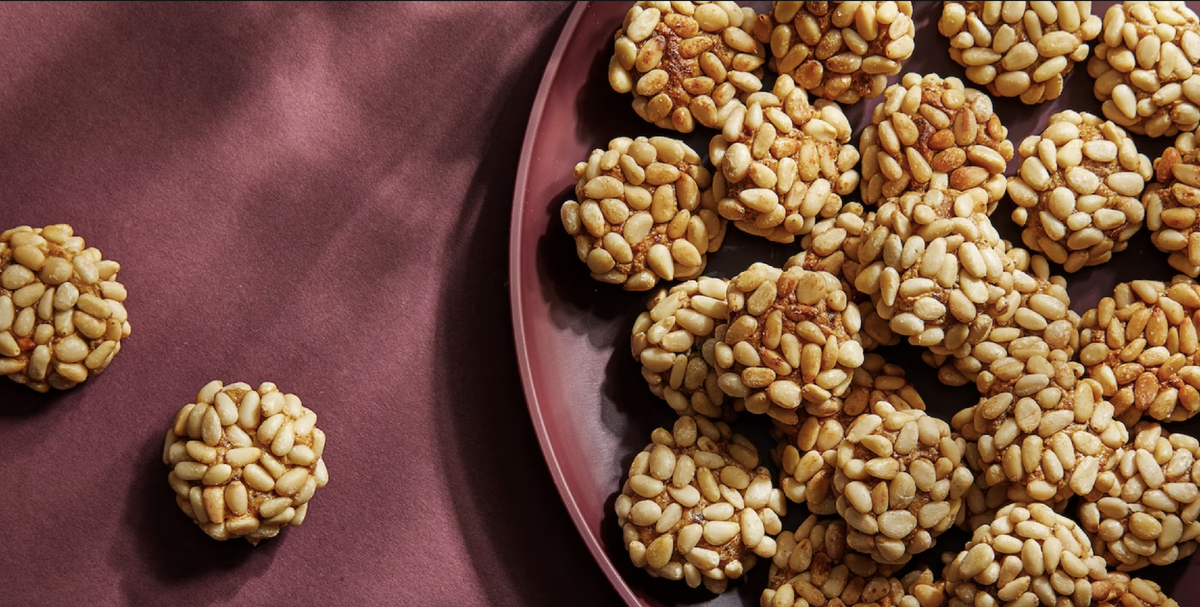 Насыпьте кедровые орехи в чашку. Поместите рядом с вашим рабочим местом миску с холодной водой. Окуните пальцы в воду, прежде чем начинать лепить печенье; это поможет предотвратить прилипание смеси к рукам. Используя 1 чайную ложку смеси, начните лепить маленькие шарики (по 8–9 граммов каждый). Затем обваляйте каждый шарик в кедровых орехах, плотно придавливая, чтобы убедиться, что они хорошо прилипли к тесту. Шаг 5