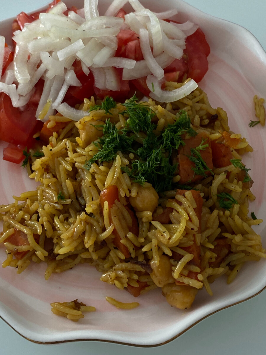 Необходимо В первую очередь, перед готовкой необходимо замочить нут минимум на 6 часов. Рис хорошенько промыть, пока вода не станет светлой и тоже можно замочить на 2 часа. Лук 🧅 очистить и нарезать кубиками , морковь 🥕 очистить и нарезать крупными брусочками, грибы промыть, нарезать тонкими пластинами. В сотейник с толстым дном, наливаем масло чтобы оно закрыла дно , раскаливаем его 1-2 минуты. В раскалённом масле обжариваем и постоянно помешивая лук, через 4 минуты добавляем морковь и тоже обжариваем на сильном огне 5 минут, постоянно перемешивая , добавляем грибы и все вместе обжариваем 10 минут, так же мешая. Лук к этому времени потемнеет, не переживайте он и даёт правильный цвет и вкус нашему плову. Хорошенько солим и добавляем специи для плова, заливаем водой и тушим минут 15, на умеренном огне, пробуем наш зиврак, он должен быть слегка горьковатым и пересоленным. Сверху выкладываем нут ( предварительно вымоченный от 6 часов) , далее выкладываем наш рис ( перед этим е