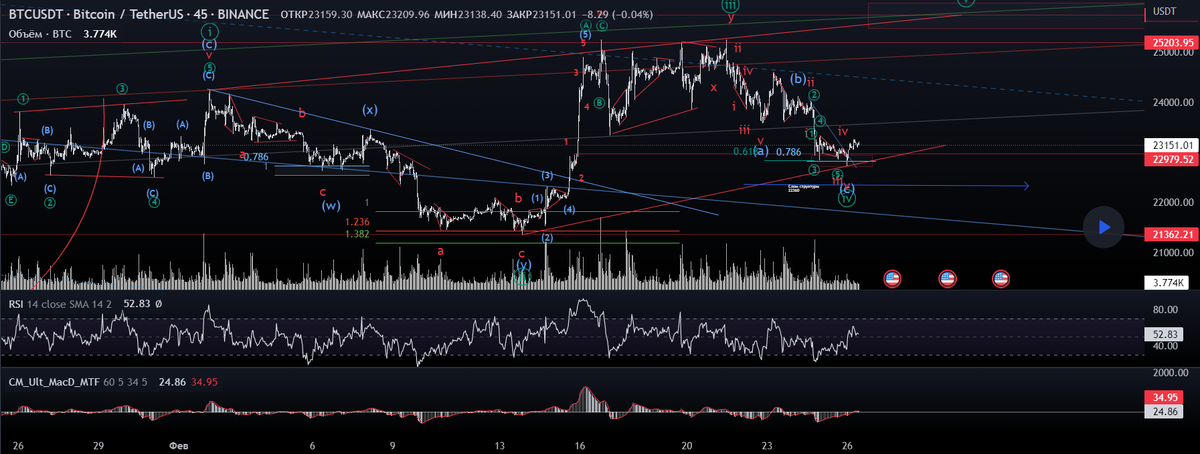 Продолжается формирование конечной диагонали. Это 5ти волновая движущая модель, после завершения которой последует коррекция. В диагонали 5 волн и все волны могут быть зигзагами или его производными (двойными зигзагами, в редких случаях тройными зигзагами). Следовательно волна 1 сформировала зигзаг (15.5к-24.2к), волна 2 сформировала двойной зигзаг (24.2к-21.4к), волна 3 сформировала двойной зигзаг (21.3к-25.2к), волна 4 сформировала зигзаг (или продолжает формирование) (25.2к-22.7к (?)). И сейчас на «старте» формирование 5й волны зигзагом (или его производным). В сужающей диагонали каждая последующая движущая волна должна быть короче предыдущей (волна 5 короче волны 3, волна 3 короче волны 1. То же самое касается и коррекционных волн) волна 4 должна быть короче волны 2. Так же волна 4 должна завершаться за вершиной волны 1 (легитимное пересечение). С правилами разобрались, теперь собственно торговый план в рамкой этой идеи. Задача определить зону завершения 4й волны и