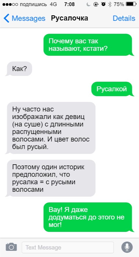 Славянская мифология довольно обширная и разнообразная, поэтому подобные переписки будут выходить еще не раз. Первая часть с домовым: Вторая часть с Бабой-ягой: Сегодняшней героиней переписок станет русалка. Конечно, об этой запоминающейся деве с длинными волосами писали не только на Руси. Русалку сейчас знает практически каждый ребенок, но только с положительной стороны: она веселая и яркая подводная жительница, дружит с крабами и мечтает о большой любви с принцем (спасибо за это мультфильмам). На деле же русалки в мифах были не такие радушные и доброжелательные, а скорее опасные и сумасбродные. Могли закидать человека камнями, защекотать до смерти или просто утянуть на глубину, завлечь и утопить. Этим историком был Соловьев Сергей Михайлович. Он не только о русалках рассуждал, советую хотя бы одним глазком глянуть его труды. Если верить фольклорным произведениям, русалки недолюбливают девушек и всячески прогоняют их, пугают. Зато молодых парней обхаживают, завлекают в воду и утягива