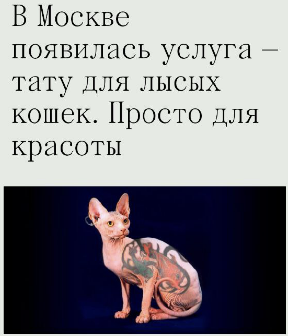 Уже второй день нам присылают в сообщениях, что якобы хотят открыть тату салон для сфинксов. Решила посмотреть и разобраться правда это или нет. Так как услышав об этом я была очень возмущена, что вообще такое могло прийти в голову людям! Вопрос зачем? Коту ваше тату явно не нужно 🤦♀️ Оказывается, необычное предложение сделал для своих клиентов тату-мастер из Москвы. Он выставил рекламу татуировок для кошек породы сфинкс. Татуировщик назвал идею «тату коту». По его словам, после процедуры животное будут привлекать внимание и может стать звездой Интернета. В размещённом посте тату-мастер, пишет что создал уникальное предложение на рынке. После процедуры питомец станет «самым модным, желанным и крутым», он будет производить впечатление на окружающих, обеспечит вам охваты в соцсетях, огромное количество подписчиков, лайков, комментариев и репостов». А стоимость его услуги начинается от 1 млн рублей! Как можно такое в своем уме написать?! Какое впечатление на друзей?!Да даже если бы эта