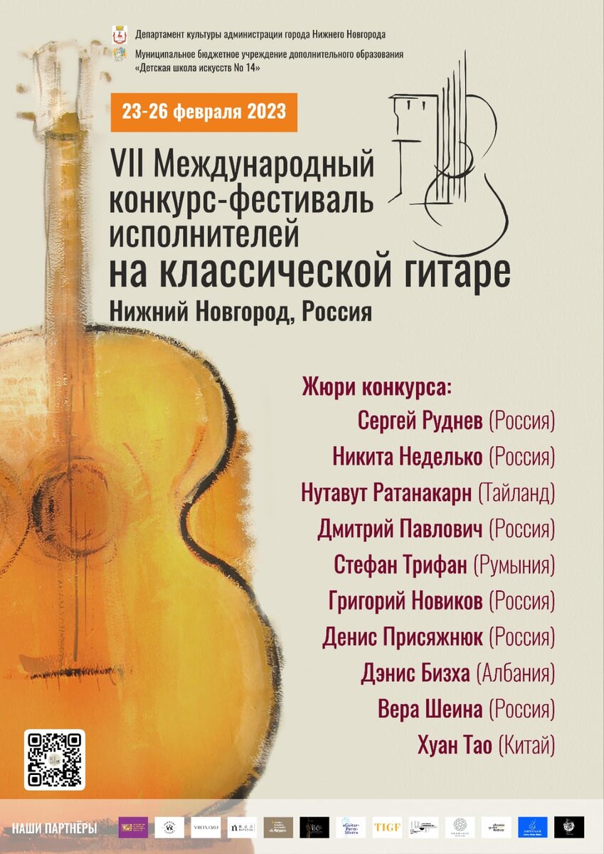 С 23 по 26 февраля в «ДШИ №14»,г.Нижний Новгород, прошел VII Международный конкурс-фестиваль исполнителей на классической гитареVII Международный конкурс-фестиваль исполнителей на классической гитаре. В 2023 году конкурс проходил в двух форматах - очно и заочно. Всего в двух форматах было заявлено 250 участников, включая номинации соло, ансамбль и оркестр из России, Мексики, Пуэрто-Рико, Китая, Албании, Болгарии, Румынии, Тайланда, Казахстана, Белоруссии. В состав жюри в дистанционном формате вошли: - ДэнисБизха - профессор в Академии Музыки «GheorgheDima» (г. Клуж-Напока, Румыния) - Стефан Трифан, кандидат философских наук, профессор классической гитары в Европейском университете (Тирана, Албания), заведующий кафедрой гитары в Национальной Музыкальной школе (Албания) - Хуан Тао -лауреат Международных конкурсов, директор Международной школы музыки «JoshuaGuitarSchool», композитор (г. Тяньзинь, Китай) - НутавутРатанакарн- концертирующий гитарист, директор Международной школы м