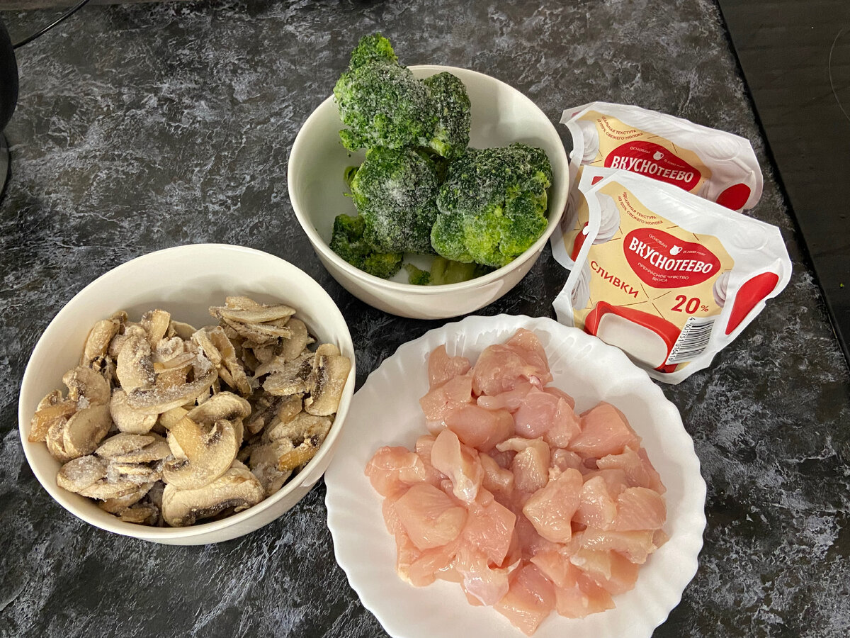 Ингредиенты (на 4 порции): 🔸 Куриное филе 300 г. 🔸 Сливки 200 мл. 🔸 Брокколи 150 г. 1) Куриное филе разрезаем на небольшие кусочки. Грибы режем «пластинками» либо кубиками. 2) Обжариваем курицу и грибы вместе. Солим, перчим. 3) Затем добавляем брокколи. 4) Заливаем сливками. Доводим до кипения и убавляем огонь на минимум, держим 7-10 минут. В качестве гарнира идеально подходит кускус. Приятного аппетита!