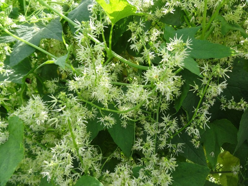 С помощью лиан легко прикрыть неприглядные постройки, оформить заборы. Вьющиеся растения способны покорять любые пространства, занимают небольшие площади. Эхиноцистис лопастной, имеет тонкие стебли, на которых отрастают усики, они то и цепляются за опору. Из-за колючих плодиков, напоминающих зеленцы в народе называют бешенным огурцом. Цветёт очень пышно белоснежными цветочками с очень приятным ароматом. Стебли тонкие и гибкие, на них отрастают усики, которые прекрасно цепляются за опору. В конце лета формирует несъедобные плоды. Мелкоцветковый клематис, к почве не требователен, но предпочитает плодородный, рыхлый грунт. Практически не требует ухода, вынослив, зимостоек. Цветёт очень пышно и во время цветения выглядит, как белое облако из мелких цветков, цветы в виде маленьких звёздочек. Во время цветения разносится лёгкий нежный аромат. Цветение происходит на побегах текущего года, зацветает в начале лета и цветёт до самой осени. Хмель обыкновенный, неприхотливая лиана с крупными рассе