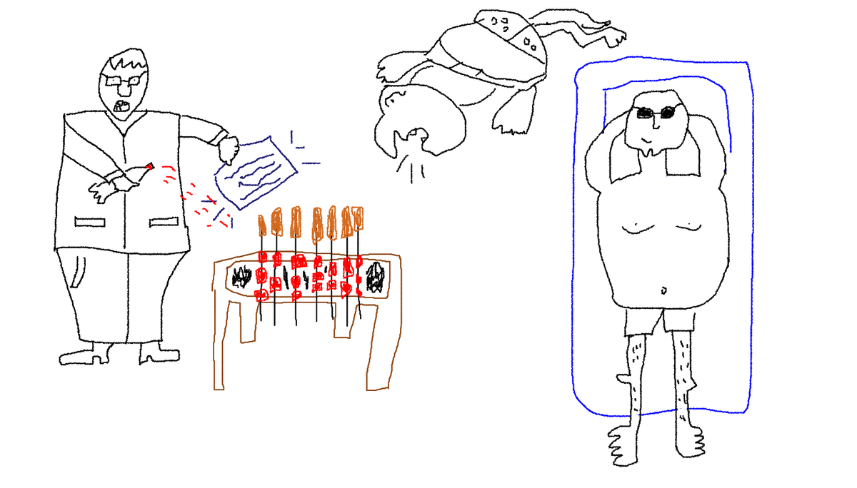 Старые друзья собрались в гостях у своего старого друга. Один лежит на синем матрасе Intex. Другой в костюме, как раз хозяин вечеринки, жарит шашлык и добавляет жидкость для розжига, чтобы угли разгорелись. А третий в труселях на корточках помогает раздувать угли. Скоро все будут кушать вкусненький шашлычок.