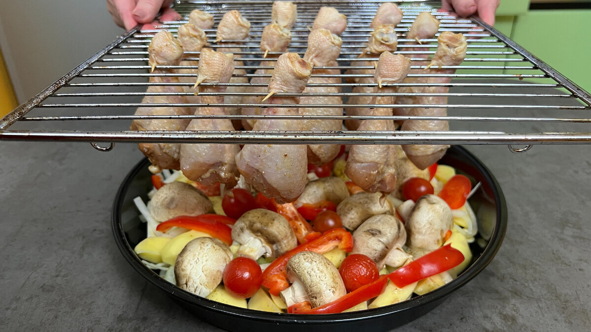 В большинстве случаев хозяйки запекают курицу вперемешку с картошкой или в пакете для запекания. При таком способе курица получится больше вареная или даже разваренная. Всем знаком этот вкус?! Но стоит взять те же ингредиенты и приготовить по иному, как результат меняется почти кардинально. Как готовить: В миске соединяем соевый соус, соль, черный перец, сушеный чеснок, горчицу, мед и оливковое масло. Натираем куриные ножки маринадом. Накрываем пищевой пленкой и убираем в холодильник мариноваться на 1-2 часа. Лук нарезаем полукольцами и перекладываем в форму для запекания. Добавляем картофель. Добавляем к овощам чеснок. Солим и перемешиваем. Нарезаем полосками перец и выкладываем на картофель. Добавляем шампиньоны. И сверху выкладываем черри. Добавляем соль, перец и оливковое масло - по вкусу. Достаем ножки из холодильника и перемешиваем. Берем решетку и между прутиков просовываем голени. Закрепляем их зубочисткой. Ставим курицу в духовой шкаф и вниз ставим овощи с грибами. Готовим