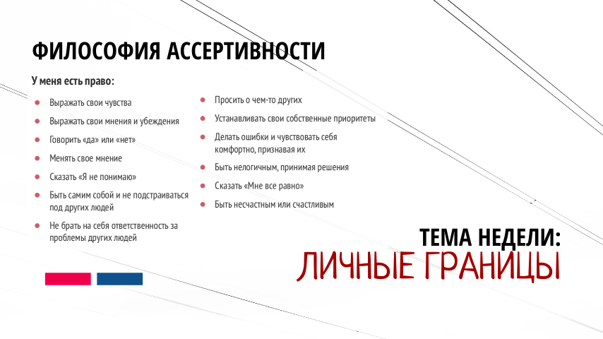 Философия ассертивности базируется на признании своих ПРАВ, как неотъемлемой части нашей личности. Иными словами, каждый из нас, просто по факту своего рождения, уже наделен правами, определяющие параметры наших проявлений. К примеру, каждый из нас имеет право БЫТЬ СОБОЙ И НЕ ПОДСТРАИВАТЬСЯ ПОД ДРУГИХ ЛЮДЕЙ. В книге "Ты имеешь значение!", авторы трактуют это следующим образом: