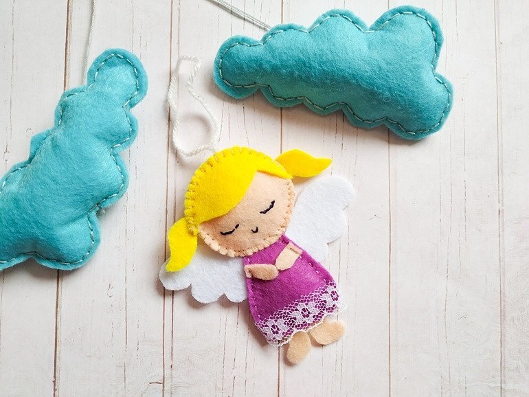 В этом мастер-классе мы сошьем из фетра милого ангелочка, которого можно использовать в качестве украшения для новогодней (рождественской) елочки. Для изготовления потребуется: На белом листе бумаги нарисуем шаблоны ангелочка. Затем каждую деталь нужно вырезать в нужном количестве. А потом все эти шаблоны необходимо перевести на фетр и вырезать. На бежевом фетре рисуем 2 детали головы, 2 ручки и 2 ножки. А из белого фетра нужно вырезать 2 белых крыла. Из желтого фетра нужно вырезать волосы, по 2 детали хвостика и по 2 детали челки. Осталось вырезать платье. Вырезаем 2 детали из фиолетового фетра или из фетра любого другого цвета. Теперь будем вышивать лицо. Черной нитью вышиваем закрытые глазки и нос. Теперь можно приступать к сшиванию деталей. Складываем вместе детали головы. Сверху помещаем деталь челки и сзади тоже. То есть помещаем сложенные детали головы между 2-х деталей волос.