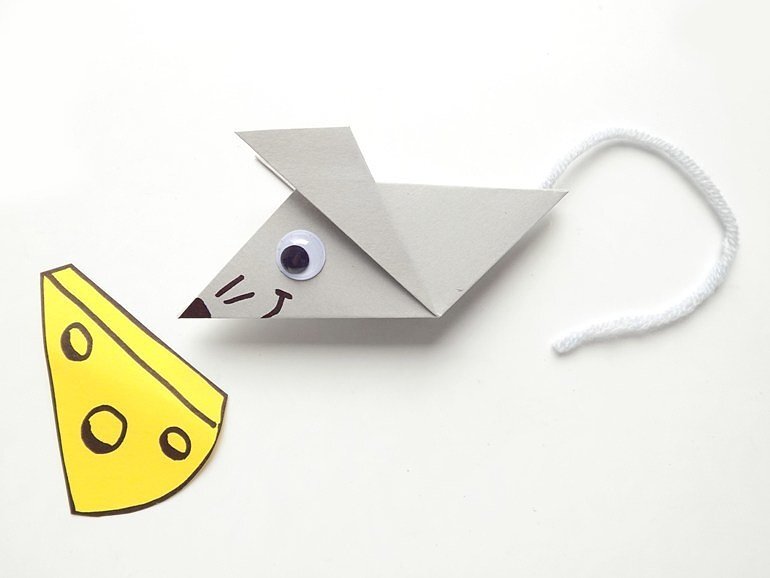 Используя приемы оригами, можно из бумаги создавать различные поделки. Если взять серый прямоугольник, то получится мышка, представленная в данном пошаговом мастер-классе. Для изготовления мышки мы взяли: Прямоугольник, используемый в этой поделке, должен иметь стороны в соотношении 2:1. В нашем случае его размеры составляют 16х8 см. Складываем пополам серый прямоугольник (линия сгиба располагается снизу). Верхний край отгибаем вниз. Потом то же самое повторяем с другой стороны. Левый верхний уголок (одного слоя) загибаем вниз. Расправляем эту сторону заготовки. Правый верхний уголок загнем к центру. Теперь начинаем заготовку складывать следующим образом. Она должна приобрести следующий вид. Переворачиваем заготовку мышки другой стороной. Здесь сначала загибаем уголок справа (все делаем в зеркальном отражении). Затем расправляем и складываем следующим образом. Левый нижний уголок загибаем вверх. Далее расправляем и на этом месте формируем внутреннюю складку. Теперь будем делать мордочк