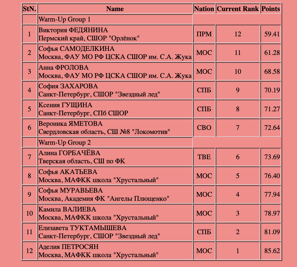 До чего же хороша Анна! Жалко, что Трусова не участвует, но замена, на мой взгляд, ничуть не хуже, хотя контент у Ани и слабее. Прокат шикарный! Очень всё в музыку, эмоционально. Технически без вопросов: хорошая работа, из ошибок только заваливание корпуса на риттбергере ближе к концу, но вытащила и не упала. Есть потери уровней на вращениях и дорожке, причём существенные, так что на это надо обратить внимание, но визуально смотрелась очень хорошо в любом случае