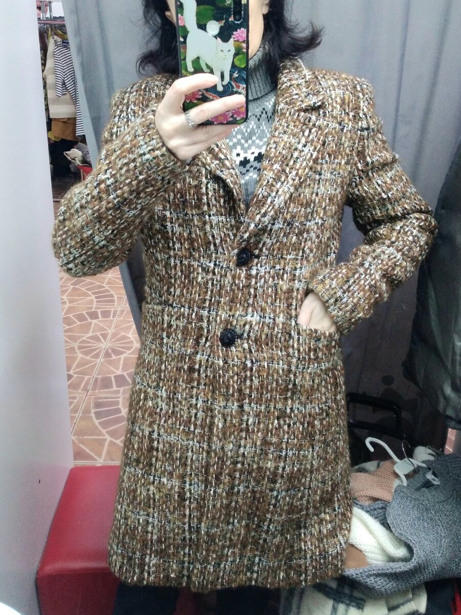Здравствуйте)). Любят мистики порассуждать о местах Силы, а секонд это место Сильных Эмоций. На скидке 80% один мужчина, уходя с покупками обернулся у выхода и прокричал" да здравствует секонд-хенд!!" Может он был счастлив от удачных покупок, может градус его радости был несколько больше градуса радости всего магазина вместе взятого. Это я не знаю и это не важно))), главное уйти из магазина пусть и уставшей, но с хорошим настроением ( и даже если без покупок ))). Обзор из магазина Столичный гардероб, всё можно было взять со скидкой 80%. Цены пишу полные. Люблю я Тайфун, одним словом молодёжный бренд. Может я себе и льщу, но подобное стремится к подобному😂. Демисезонное пальто из довольно рыхлой неплотной ткани. Вот такая она пестренькая вблизи. И зачем-то в неё добавили люрекс, хотя если учесть, что для молодёжи..., то почему и нет. Много чего намешано в составе, но радует присутствие шерсти и мохера. 1800 руб. Зимние сапоги, кожзам. Кожа на голенище очень мягкая, но зато удобный к