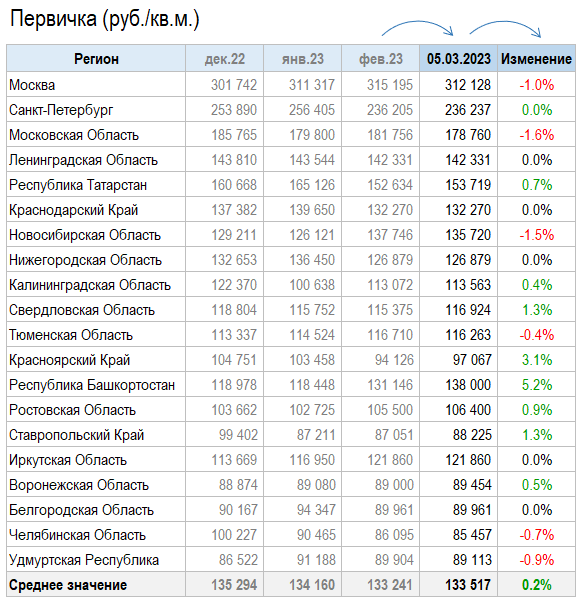 Продолжаю традиционный воскресный мониторинг недвижимости. Сегодня, по данным Домклик, ценники первички и вторички в двадцати самых живых регионах выглядят так: За пять дней Марта продавцы слегка подкрутили ценники вверх. На первичке лидируют башкиры, на вторичке - татары. График изменения средних цен: Текущий спред составляет 18.6%. В начале каждого месяца выкладываю сводную диаграмму, показывающую разницу цен первички и вторички в двадцати регионах: Башкирские новостройки - туземун. Видимо, тамошние чиновники, крышующие застройщиков, вообще прекратили ремонт и обслуживание старых домов, чтобы местные жители выстроились в очередь за новоделом. Кто знаком с ситуацией в тех краях, напишите, пожалуйста, в комментах. Смотрим предложение: График изменения предложения: Объем предложения вторички больше предложения первички на 66%. Сводная диаграмма разницы предложений: В Подпитерье предложение новостроек на 46% превышает предложение вторички. Выглядит это необычно. Почти во всех регионах ка