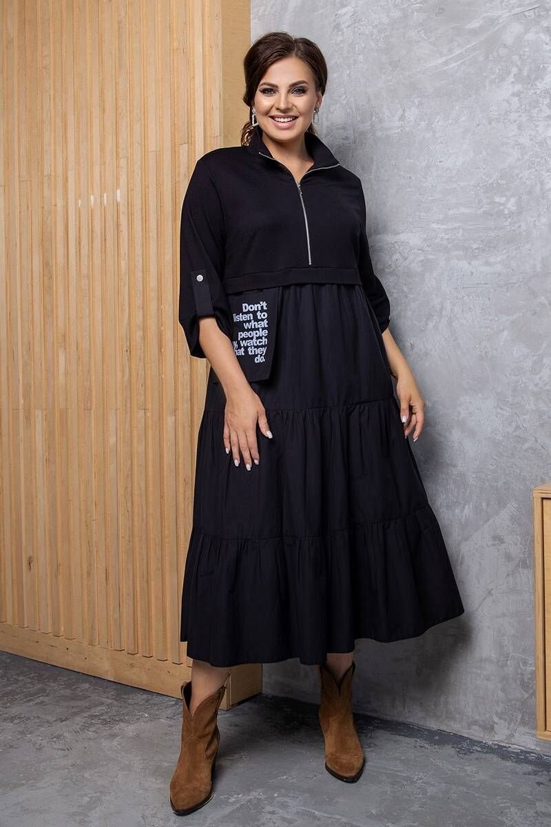 - Интересная модель, которая сделает ваш образ современным и без использования дополнительных деталей. Платье отрезное выше линии талии с трехъярусной юбкой. Застежка на замок-молнию, вшитую по центру переда. Рукава длиной три четверти с декоративными подхватами в нижней части. Украшает платье большой карман с принтом-надписью. Такое платье идеально подойдет для самой сложной фигуры типа «яблоко».