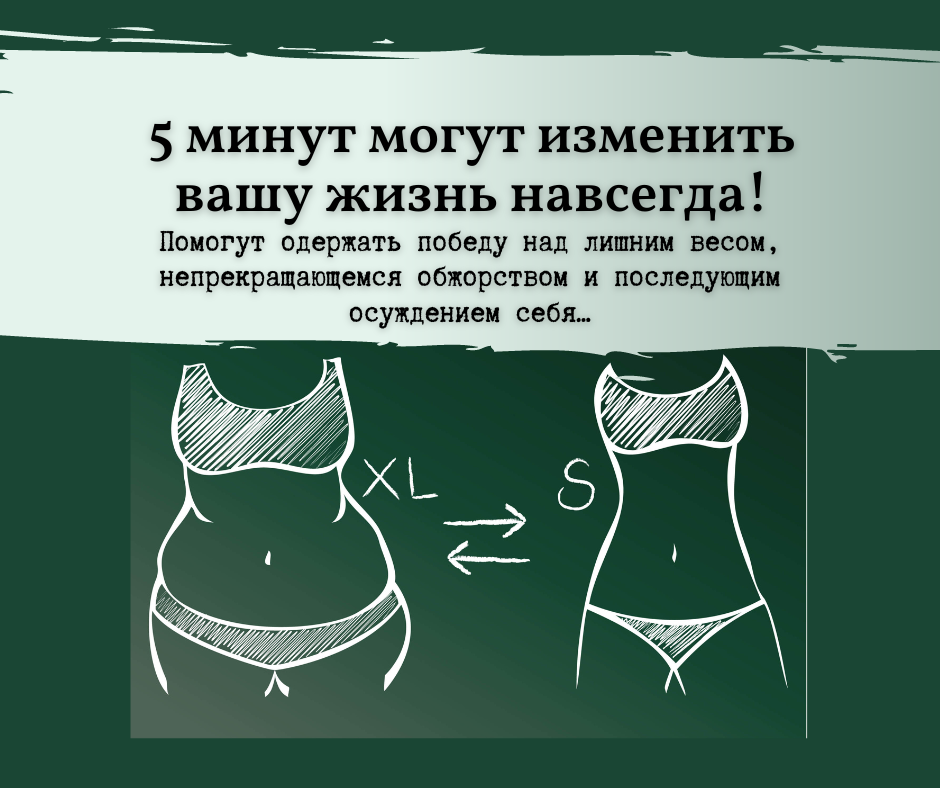 5 минут могут изменить вашу жизнь навсегда! Помогут одержать победу над лишним весом, непрекращающемся обжорством и последующим осуждением себя…
