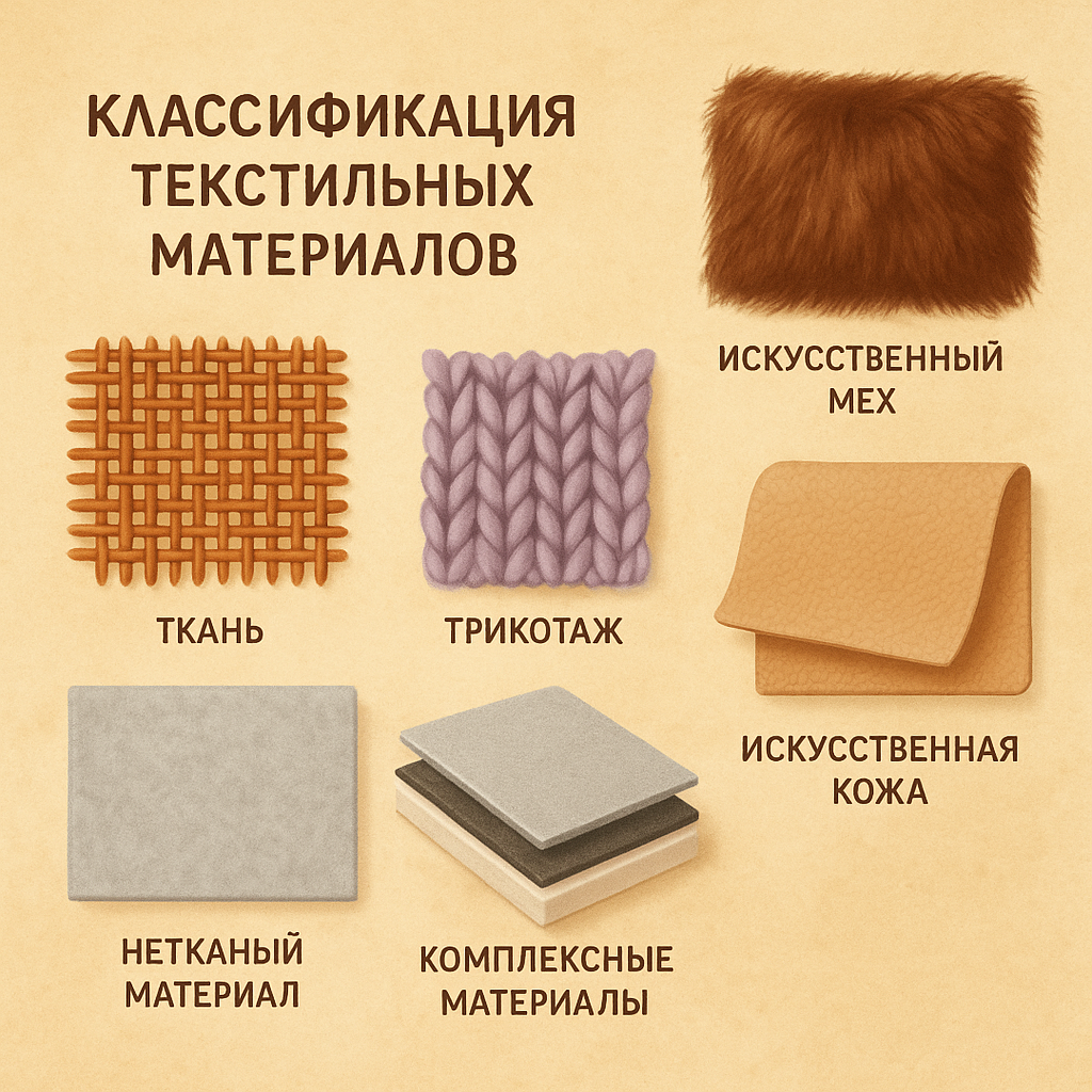 Классификация текстильных материалов по ТН ВЭД включает основные признаки: вид материала по способу изготовления, волокнистый состав и его процентное содержание, вид и структура нитей, колористическое оформление, плотность. Текстильные материалы (раздел XI ТН ВЭД ЕАЭС) классифицируются по способу изготовления: 1.Ткани 2.Трикотажные полотна (продольно-вязанные и поперечно-вязанные) 3.Нетканые материалы 4.Исскуственный мех (ворсовые материалы) 5.Исскуственная кожа (текстильные материалы, с покрытием, пропитанные или дублированные) 6.Комплексные материалы (состоящие из нескольких слоев) 1. Ткань – это текстильный материал, полученный путем взаимного перекрытия нитей основы и утка на ткацких станках. 2. Трикотаж - вязаное полотно или изделие, образованное из текстильных нитей, состоящих из петель. В петлях трикотажа нити изогнуты, соединены менее жестко, чем в тканях и образуют подвижную структуру, которая определяет отличие трикотажа от тканей по свойствам. 3. Нетканые матери