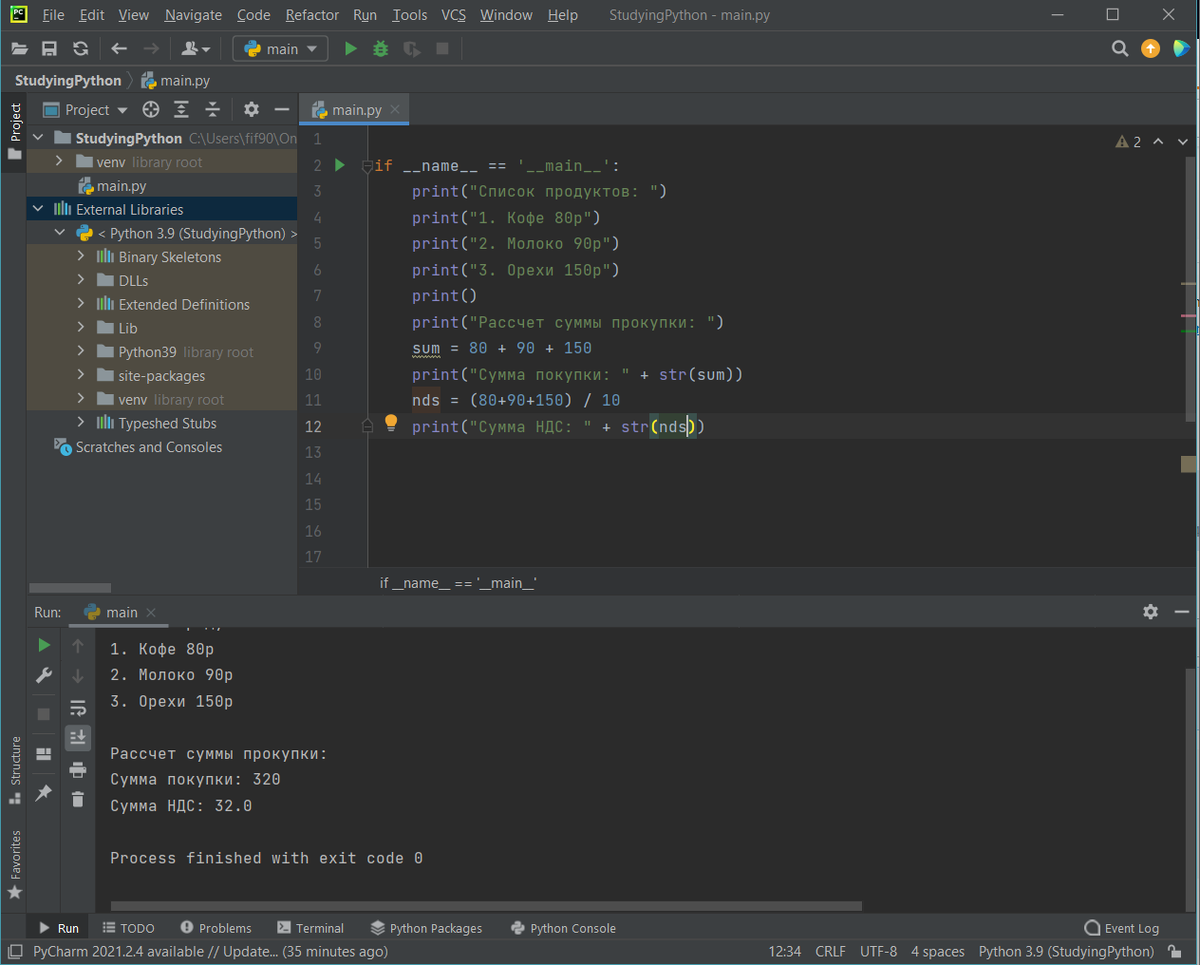 Для вывода информации о работе программы в консоль IDE является метод print. Как привило, в разных языках программирования по-разному выглядит такой метод. Пример: print("Привет читатель") Вывод: Привет читатель Задача Вывести в консоль стоимость продуктов и рассчитать их сумму, а так же вывести НДС 10% от это суммы. Python поддерживает все стандартные арифметические действия: умножение(*), деление(/), сложение(+), вычитание(-). Типы данных. В Python как правило есть 2 простых типа это Числа и Строки (String (str)). Числа делятся на 2 типа это целочисленные (Integer (int)) и числа с плавающей точкой (float). В Python динамическая типизация, это нам говорит о том, что переменная может создаться как число, а затем стать строкой, а потом снова числом. Пример: name (имя переменной) = "Лёха" (значение переменной) То есть мы создаем переменную типа String и присваиваем ей значение "Лёха". Аналогично делается для int и float. Задача Написать программу, которая будет рассчитывать кол-во