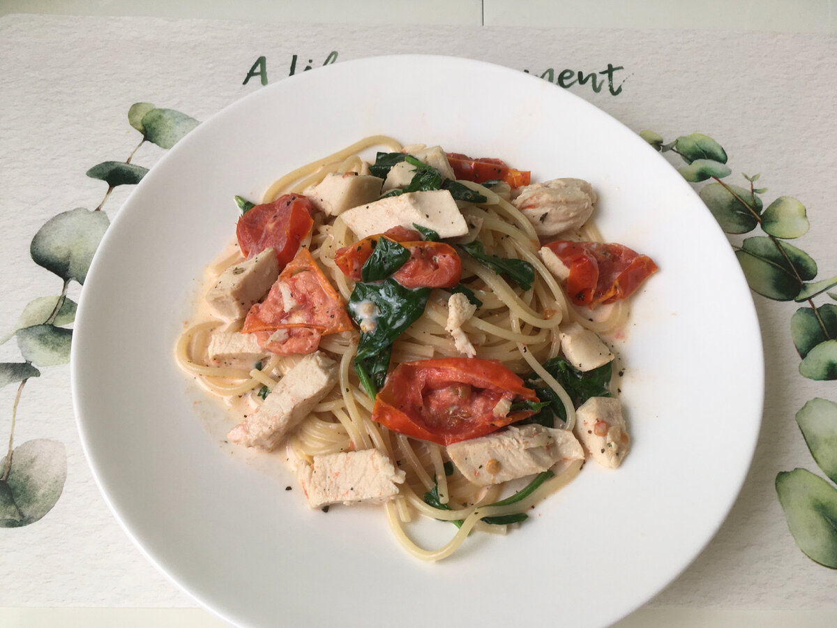 Привет, всем хорошего дня. Вариация на тему итальянской кухни. Готовится очень быстро. В этом блюде можно использовать любую пасту (спагетти, пенне, и др.) Ингредиенты: 2 шт. – куриное филе 250 – макарон из твердых сортов пшеницы (спагетти, пенне и др.) 1-2 - зубчика чеснока 2 шт. – помидор средний 50 г. – шпинат Соль, перец, орегано 2ст.л. – оливкового масла 300 мл. - 10% или 20% сливок Способ приготовления: 1. Подготовить ингредиенты 2. Отварить пасту (у меня спагетти) 3. Куриное филе нарезать небольшими кусочками примерно 2/2 см 4. На сковороде разогреть растительное масло и обжарить до темного цвета крупно нарезанный чеснок. Потом его выбросить. Масло пропитается вкусом и запахом чеснока 5. Выложить куриное филе и обжарить на среднем огне до румяности. 6. Влить 50 мл. жидкости, в которой варились макароны, добавить сливки и хорошо перемешать. Добавить соль, перец, орегано по вкусу. 7. Протушить несколько минут. Когда сливки начнут густеть в сковороду выложить нарезанные помидо