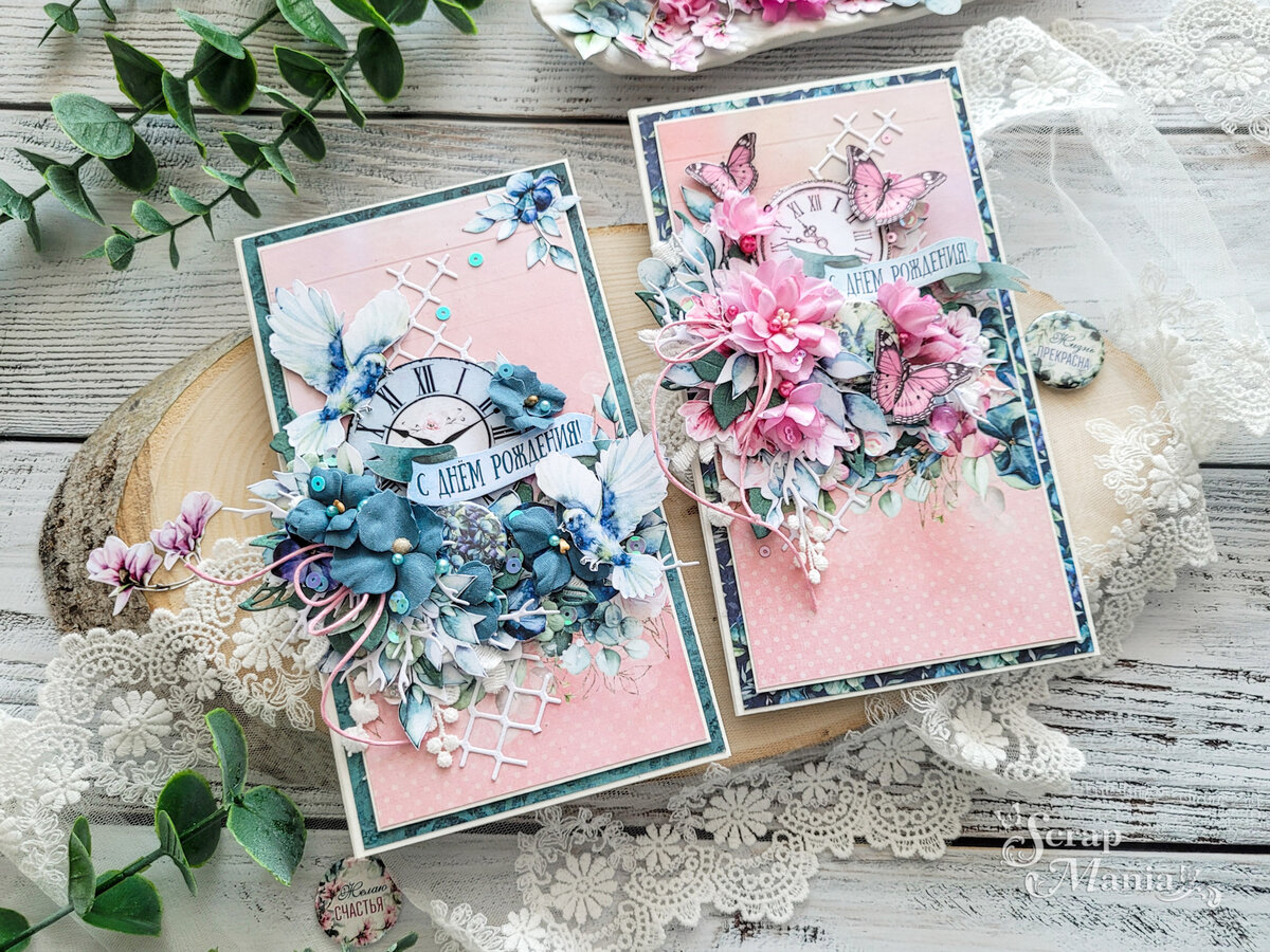 Всем привет! С вами сегодня Elena Veres, и я рада приветствовать вас на втором этапе совместного проекта "Весны прекрасные слова". На этот раз слова поздравлений прозвучат в адрес именинников и юбиляров. На втором этапе мы творим открытки, обязательными элементами которых являются цветы, фишки и поздравительная надпись "С Днем рождения!" или "С Юбилеем!". Я создала свои открытки из яркой, сочной и насыщенной колекции "Весенний этюд". В наборе высечек я нашла цветы всевозможных оттенков и дополнила их тканевыми цветами - это наш первый обязательный элемент. Две чудесные фишки из набора "Весенний этюд. Жизнь прекрасна" стали вторым обязательным элементом. А красивые поздравительные надписи на развивающихся флажках, которые идеально подошли и по форме, и по цветовой гамме к композициям на открытках - это надписи из скрап-карты коллекции "Веселый паровозик". Думаю, посмотрев на открытки первый раз, вы даже не подумали, что эти надписи из другой коллекции? Для оформления открыток я выбрал
