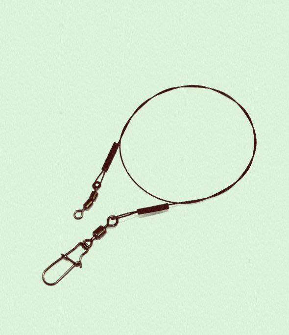 Почти всем этим требованиям (кроме эластичности) вполне удовлетворяет поводок из стальной проволоки круглого сечения 0,25-035 мм. Он отличается прочностью, малозаметен в воде и долго служит. Продаются такие поводки как цельные так и трёх-и пятиколенчатые, длиной от 50 до 100 см. Конец поводка, как правило имеет карабин с петелькой для соединения его с грузиком и блесной. Средняя длина поводка для двуручного удилища примерно 70 см (при желании её можно увеличивать или уменьшать, некоторые спиннингисты используют поводки 20-30 см), а для одноручного 45 см, но не более 70 см, так как большая длина поводка при од