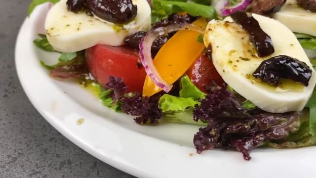 Полезное, сочное блюдо со свежей зеленью и оригинальной заправкой. Море витаминов в вашей тарелке. 🔥 Лучшее в телеграм: Посмотреть Ингредиенты: Способ приготовления: Шаг 1. Помидоры нарежьте крупными дольками. Нашинкуйте полукольцами лук. Оливки выньте из масла и удалите кончики. Масло оставьте для заправки. Моцареллу нарежьте крупными ломтиками. Шаг 2. Подготовьте заправку. Соедините в емкости оливковое масло, добавьте щепотку итальянских трав и оливки. Масло, которое было в оливках добавьте сюда же. Поперчите и посолите по вкусу, добавьте немого бальзамического соуса. Хорошо все перемешайте. Шаг 3. Возьмите блюдо для подачи и застелите дно листьями салата, предварительно крупно их нарвите. Добавьте сверху листья руколы. Разложите сверху помидоры, посыпьте луком. Разложите по кругу кусочки сыра. Сверху блюдо обильно полейте заправкой с оливками.