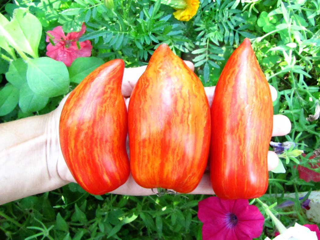 Томат "искры пламени" имеет высокий рост, достигающий 1,5-2 метров. Его удлиненные плоды имеют цилиндрическую форму и длину до 13 см. На их концах есть заостренный носик, который придает плодам сходство с языками пламени.