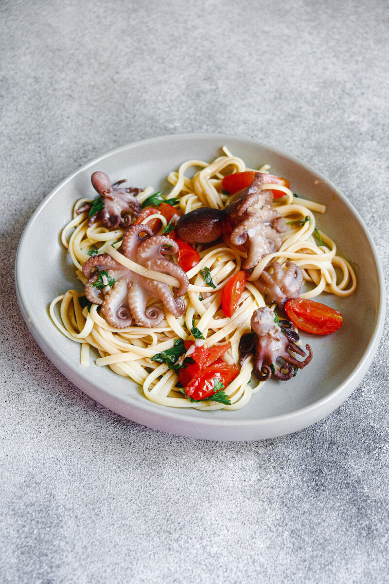 Готовим дома, как в ресторане. Вкусно и красиво! И сегодня мы с вами приготовим пасту с молодыми осьминожками. Ингредиенты: Осьминожки 150гр Чеснок 2 зубчика Белое сухое 100мл Помидоры Черри 150гр Пучок петрушки ⠀ 1. Мелко рубим чеснок, петрушку, помидоры разрезаем на половинки 2. Осьминожки обжариваем на оливковом масле 2-3 мин на сильном огне, уменьшаем огонь добавляем чеснок, жарим 1мин, вливаем вино и добавляем помидоры 3. Тушим на медленном огне минуты 2-3 4. Спагетти заранее отвариваем, добавляем к осьминожкам, если необходимо добавить немного воды от спагетти 5. Посыпаем все петрушкой и готово Приятного аппетита! Кушайте вкусно с Рыба моя❤️