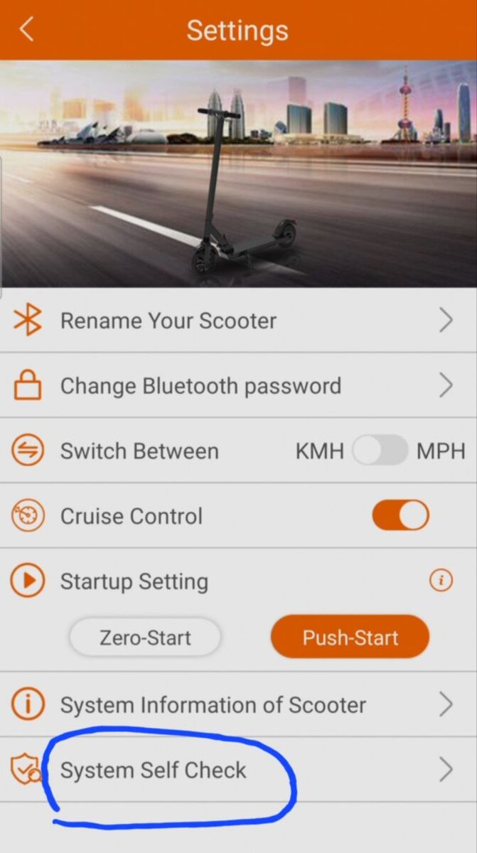 Проверить первостепенно можно самостоятельно, при помощи мобильного приложения KugooKirin, для этого включаем самокат, включаем блютуз в телефоне, соединяемся телефоном с эл.самокатом при помощи мобильного приложения, пароль "000000" и далее в мобильном приложении в правом верхнем углу нажимаем на шестерёнку, переходим в режим настроек. Опускаемся вниз и выбираем пункт System Self Check.