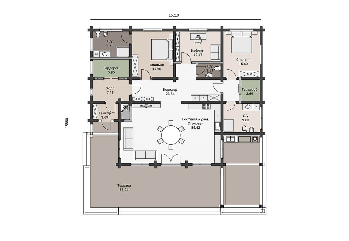 Одноэтажный. Несмотря на все ограничения возведения сруба из клееного бруса, вариант удобный для проживания есть. Проект Олимпия ООО "НАРХОЗСТРОЙ" 24 654 500 ₽ без отделки. https://xn--h1aieheg.xn--d1aqf.xn--p1ai/igs/project/1472?decorationId=1982 Вот этот дом, кажется продуманным. Во-первых, один этаж. Во – вторых соотношение наружных и внутренних стен продумано. Поэтому небольшие перегородки - каркасные. В – третьих три санузла. Для небольшой семьи, прекрасно. Две мастер спальни, гостевой санузел и возможность разместить гостей в кабинете. В – четвертых тамбур! Решение практически идеальное для сруба из клеёного бруса! НО! ТЕХНИЧЕСКИЕ ПОМЕЩЕНИЯ НУЖНО ПРИСТРАИВАТЬ!! Клееный бус - что ВЫ хотите? Кстати единственный победитель конкурса ДОМ. РФ. SWIDOM https://xn--h1aieheg.xn--d1aqf.xn--p1ai/igs/project/179?decorationId=2173 явно уступает планировочными решениями и одним туалетом на 2 спальни, и входом в туалет через котельную !!!???? Зато есть котельная. А вот двухэтажный с идеальной