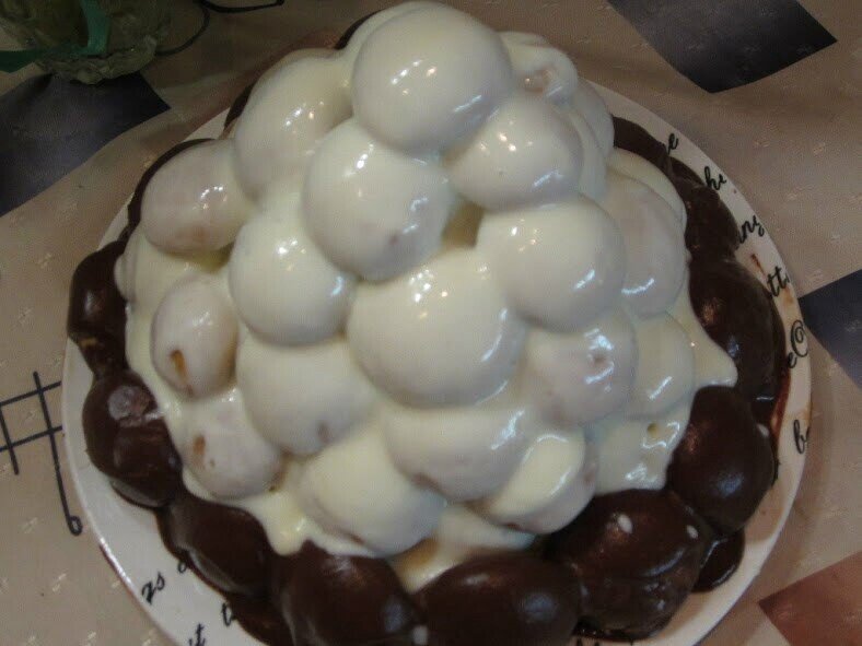ПРОДУКТЫ: Тесто: 3 ст.муки, 1 ст.сахара, 1 ст. л. меда, 100 гр слив.масла, 2 яйца, 1 ч. л. гашеной соды. Шоколадная глазурь: в глубокой кастрюле смешать 300 гр густой жирной сметаны, 1/2 стак. сахарного песка, 4 ст. л. какао-порошка.И довести до кипения. Снять кастрюлю с огня и добавить 50 гр слив.масла. Сметанный крем: взбить 200 гр густой сметаны с 1/2 стак. сах. песка до полного растворения сахара. 1. Смешать все ингредиенты для теста, сделать шарики размером с грецкий орех. Выпекать при температуре 170-180 гр 10-15 минут до желто-коричневого цвета. Остудить. 2. Плоское круглое блюдо покрыть шариками (это дно гнезда). 3. Залить дно горячей шоколадной глазурью. Сделать из шариков бортик (гнездо) и залить его оставшейся глазурью. 4. Все остальные шарики складывать внутрь гнезда, обмакивая в сметанный белый крем. И залить сверху белым кремом. Белые шарики — это яйца в гнезде. 5. Поставить торт на холод на 2-3 часа. Приятного аппетита!