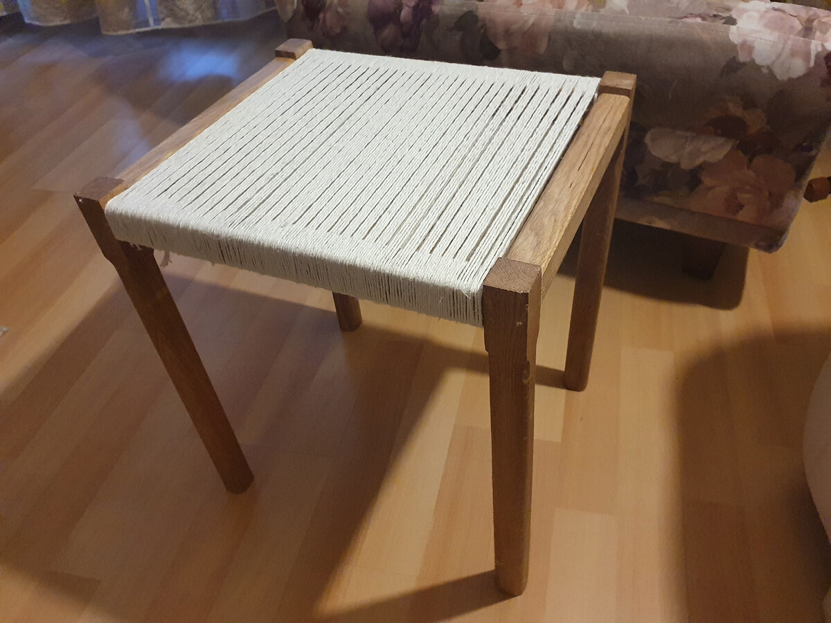 Преисполнившись зарубежным контентом с жутким зудом в руках . Захотелось мне своять табурет. Но табурет довольно таки простой предмет (4 палки и сиденье). Этот простой предмет захотелось сделать уникальным. Выбор пал на "Датский табурет. Его особенность, заключается в плетеном сиденье. Плетеная мебель отличается легкостью и затейливым рисунком. При этом всегда ассоциируется с теплом лета и свежестью загородного воздуха. В целом это прекрасный легкий предмет интерьера, который легко вписать куда угодно. Взяв пару дубовых досок. Я выпили из них ножки и царги. Царга это соединяющий элемент какой либо мебели. Далее началось самое интересное. Плетение. Перед тем, как начать плетение подготовьте каркас и поставьте его на возвышение — так вам удобно будет с ним работать и плетение пойдет быстрее. Кроме того, потренируйтесь сплетать синтетические нити на одном «тестовом» месте. Ведь если в процессе работы вы сделаете ошибку в узоре, придется переплетать полотно заново. Процесс этот не быстр