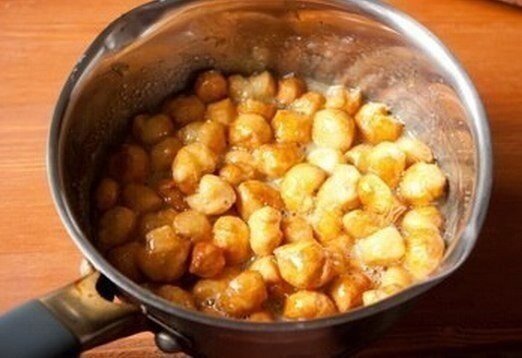 4. В несколько партий обжариваем кусочки теста до золотистого цвета со всех сторон. Кусочкам теста в сковороде не должно быть тесно.