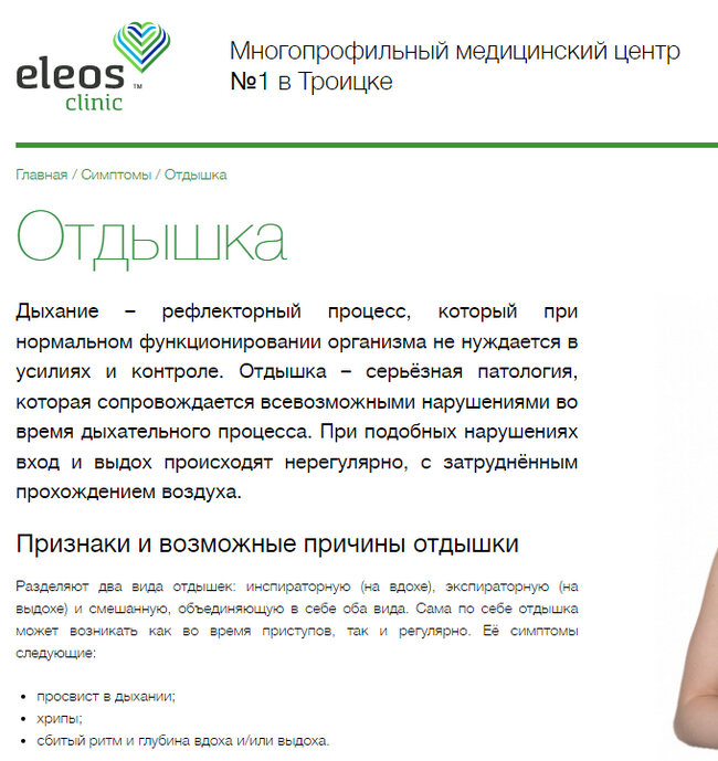 Поймал себя на том, что очень часто встречаю в интернетах слово одышка, написанное через «т»: отдышка. Видимо, здесь сыграл роль глагол «отдышаться», означающий «восстановить равномерное дыхание, начать снова ровно дышать». Так вот, Одышка (диспноэ) — нарушение ритма, частоты, глубины дыхания, субъективное ощущение нехватки воздуха, затруднение дыхания. Это жалоба, с которой пациент прежде всего обращается к врачу. Данный симптом может быть проявлением различных заболеваний, чаще всего астмы или сердечных патологий. «Отдышка» — короткий отдых, передышка. Слово в настоящее время употребляется редко, к тому же существует масса синонимов. Вишенка на торте: скриншот с сайта медицинского центра в Троицке. Вы, конечно, можете возразить, что текст на сайте принадлежит перу безграмотного копирайтера, но я всё же подумал бы, идти туда лечиться или нет. Пост автора dumpster.diver. Читать комментарии на Пикабу.