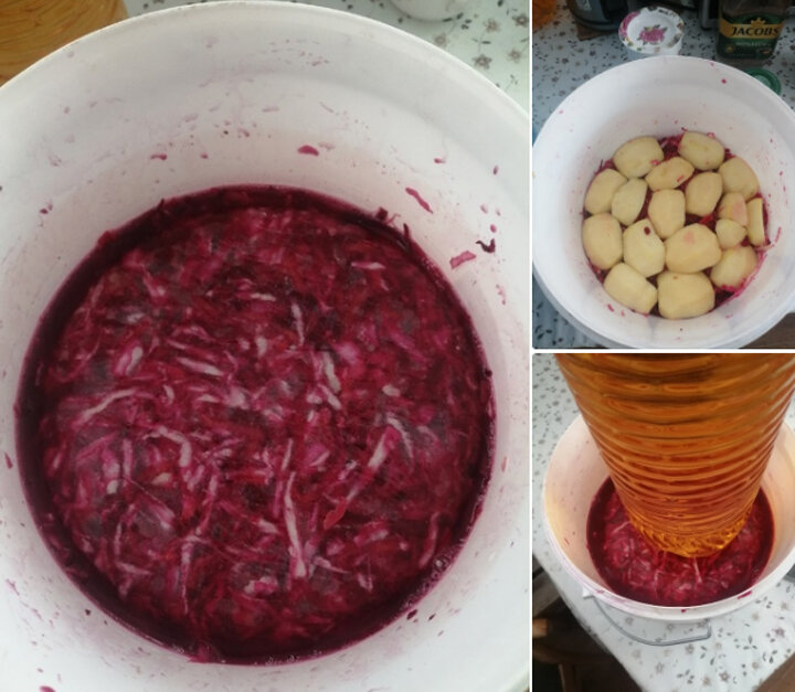 Давайте сделаем ферментированные овощи, как стало модно говорить. А по-простому - будем просто квасить капусту с разными добавками. Шинкуем капусту, трём на крупной тёрке туда же морковь и свёклу. Солим чуть-чуть покрепче, чем на салат, и убираем в сторону. Очищаем яблоки (желательно зелёные), разрезаем их на четыре четвертинки, отдельно натираем корень сельдерея. Начинаем выкладывать в ёмкость. Слой капусты, слой яблок. На яблоки посыпаем тёртый корень сельдерея, опять выкладываем слой капусты, яблоки с сельдереем и завершаем капустой. Прижимаем грузом и ставим в тёплое место для брожения. Появились пузырьки – протыкаем. И так по накатанной, пока капуста не заквасится. Единственное - не сфоткала посыпку сельдерем. Отвлеклась на звонок. Приятного аппетита! От редакции: Содержащийся в овощах сахар в процессе молочнокислого брожения (ферментации, или заквашивания) почти весь сбраживается в лактат, аденозиндифосфат, ацетат, ацетоин и этанол. Так что квашеных свёклы, морковки и яблок боять
