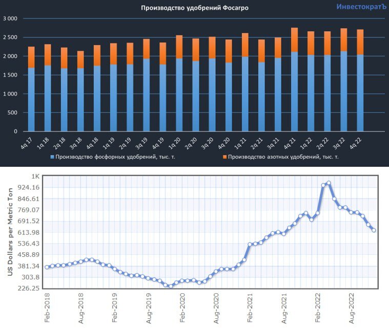 📈 За 2022 год бизнесу удалось произвести более 11,1 млн т. удобрений и прочей химической продукции, что на 4,6% больше результатов 2021 года. Объемы реализации также превысили 11 млн т., что выше позапрошлогоднего результата на 6,4%. Картина в операционных результатах достаточно уверенная, несмотря на кризис и санкции против РФ.