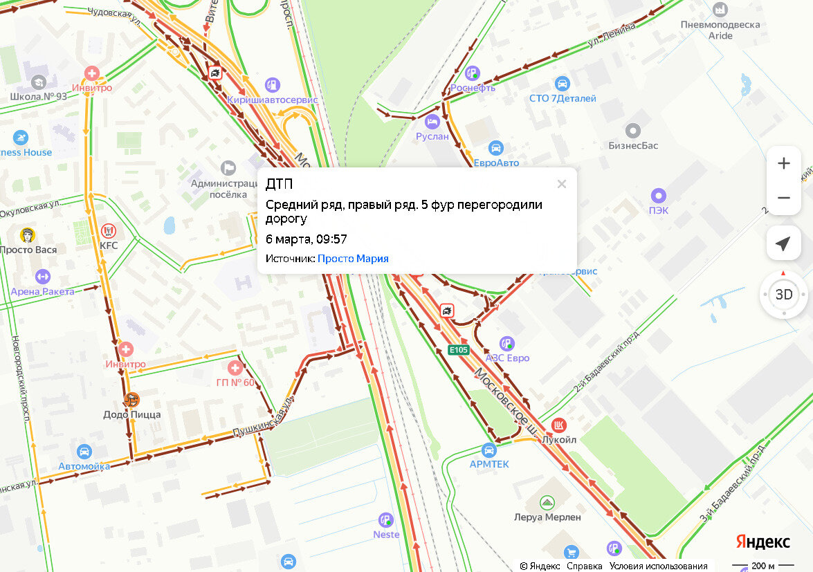 Московское шоссе встало в многокилометровой пробке: фурам не заехать на мост Снежная погода и грузовики устроили транспортный коллапс в Пушкинском районе Петербурга утром 6 марта. В огромной пробке встало Московское шоссе. По словам участника группы «ДТП и ЧП | Санкт-Петербург» Сергея, на Московском шоссе фуры не могут заехать на мост. На дороге — снежная каша. Из-за большегрузов стоит и другой транспорт. По данным «Яндекс.Пробок», затор в сторону Петербурга тянется от АЗС «Газпромнефть» до Витебского проспекта. Его длина составляет 7,8 километра — это уже больше половины заторов в утреннем топ-5. В пробке можно потерять почти полтора часа, тогда как обычно этот участок проезжается за 38 минут. Затор наблюдается и в сторону области: плотнее всего от КАД до Паровозной дороги, затем — на перекрестке с Курьерским проездом и после — перед Ленсоветовской дорогой. Пробки и аварии растут на заснеженных дорогах Петербурга второй день. Накануне «день жестянщика» продолжался до самой ночи. А утр