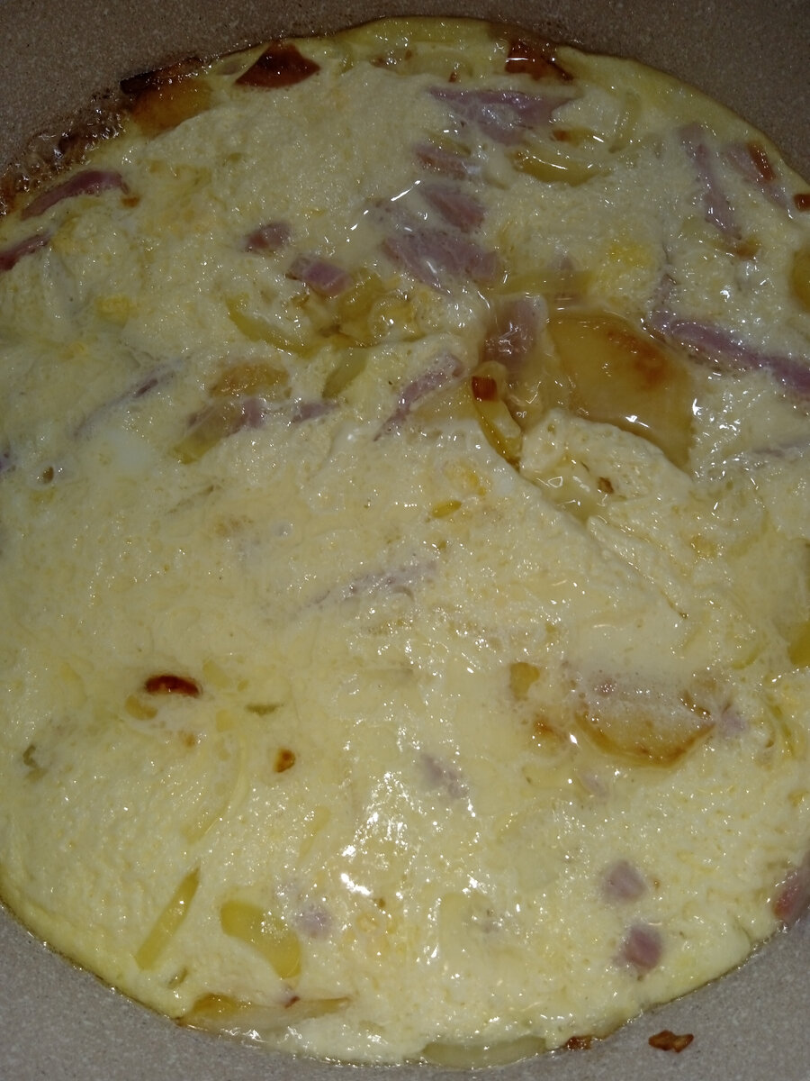 Вареную картошку нарезать дольками толщиной около 0,7 см. и обжарить в небольшом количестве растительного масла. Когда картофель зарумянится с одной стороны, перевернуть и добавить лук, нарезаный полукольцами. Ветчину нарезать длинными кусочками и добавить в сковороду. Убавить огонь. Разбить яйца, добавить соль, взбить яйца вилкой или венчиком. Добавить молоко. Объем яиц и молока должен быть примерно одинаковым, можно добавить чуть больше молока. Залить яйцами обжпренную картошку с ветчиной. Накрыть сковороду крышкой и готовить на медленном огне, пока омлет не поднимется. Подавать омлет можно подавать с овощным салатом. Приятного аппетита.