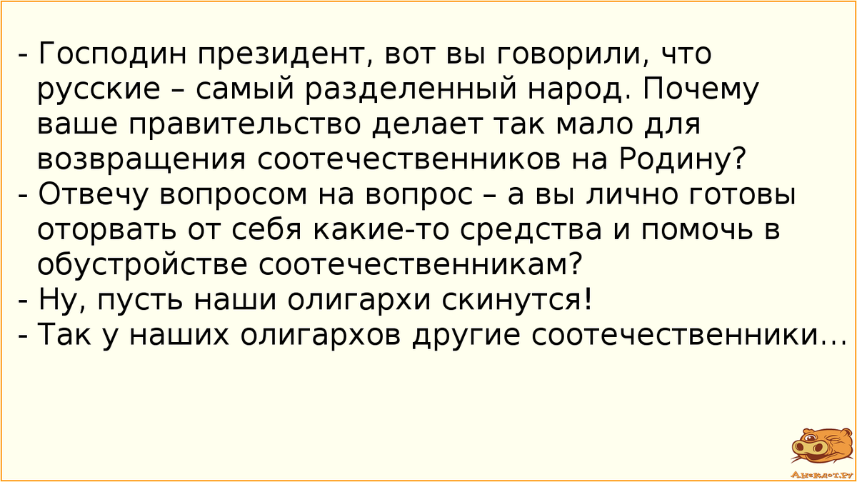 1. Сидит новый русский на нудистском пляже, а его и спрашивают:- Чего это вы пиджак не снимаете?- Это зачем?- Ну, здесь нудистский пляж, здесь не принято быть одетым.- Как нудистский пляж? А в турбюро сказали, что если штука баксов - то специально для вас массовый стриптиз! 2. Пуля очень многое меняет в голове, даже если попадает в задницу. 3. На конкурсе гинекологов первое место занял врач, который обклеил коридор в своём доме обоями... через щель в двери "Для писем и газет". 4. Дай человеку рыбу – и он будет сыт один день. Погугли один раз про рыбу – и будешь видеть рекламу рыб всю жизнь. 5. - Машенька, спой бабушке песенку!- У меня братишки нет, у меня сестрёнки нет, мама папе делает...- Так, всё, хватит! 6. Реклама от военкомата. Дорогие призывники приведите в военкомат трёх таких же, как вы парней, и получите освобождение от службы в армии... 7. Всё в нашей жизни ломается: чувства, люди, утюг... Особенно утюг меня расстроил. Вот уж от него не ожидала! 8. Парень, воспитанный по при