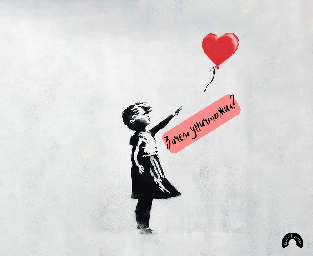 В 2006 году эта работа была перенесена акриловыми и аэрозольными красками на холст, что уже весьма необычно для автора. В 2018 проходит аукцион одного из домов, где эта картина покупается за миллион фунтов. После третьего удара молотка активируется шредер (устройство для нарезания бумаги на полоски), и половина картины становится разрезанной на куски. Шредер был встроен в раму самим художником за несколько лет до этого. Бэнкси - противник заоблачных сумм за предметы искусства, а данное событие было актом сопротивления. Однако после прецедента картина только выросла в цене. Спустя некоторое время картину продали в 18 раз дороже первоначальной суммы. Увы...