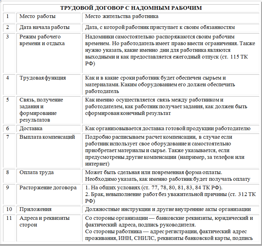 Все отношения между предприятием и надомным рабочим регулируются ТК РФ и ТД. Рассмотрим основные пункты договора.