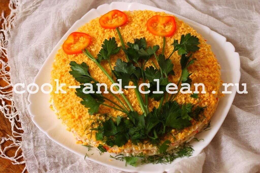 Закусочный пирог из крабовых палочек, украшенный цветами, можно приготовить на любой праздник. Особенно актуальны украшения цветами становятся весной. А это праздник 8 марта – день всех женщин. А если делать такой пирог на новогодний стол, то цветы можно заменить украшением в виде елочки из зелени. Такой пирог точно украсит праздничный стол и поднимет настроение всем окружающим. Если вы хотите приготовить что-то необычное, вкусное, но использовать традиционные продукты для салатов, то этот рецепт должен вам понравиться. Благодаря вафельным коржам вкус у закусочного пирога получается очень нежным, а времени на его приготовление вы потратите совсем немного. Процесс сборки пирога займет у вас не более 15 минут. Отварить и натереть продукты лучше заранее. Подготовьте вафельные коржи. Не обязательно использовать круглые коржи, вполне подойдут и прямоугольные или квадратные. Смотрите, какие будут у вас в супермаркете. Это не принципиально. Выложите первый корж. Крабовые палочки очистите от