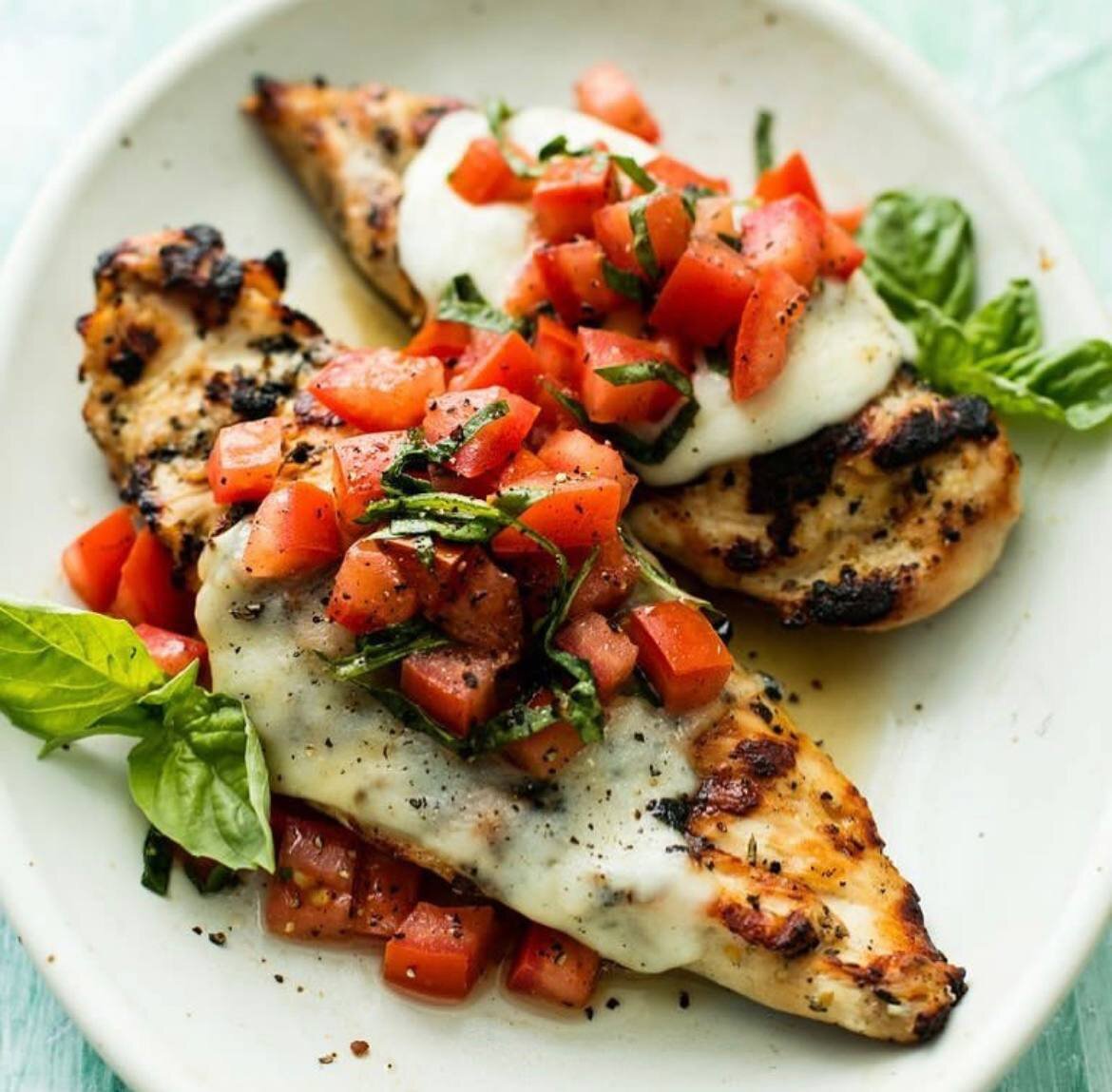 3. Пока обжаривается филе, нарежьте помидоры и чеснок и смешайте с базиликом и соком второй половинки лимона. Посолите и поперчите. Пока курица на гриле, на каждую грудку положите ломтик моцареллы. Когда сыр начнёт плавиться, выложите сверху смесь из помидоров.