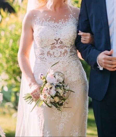 Дело было несколько лет назад, я тогда только начала заниматься сложными свадебными платьями. Клиентка получила предложение руки и сердца в сшитом мной наряде и решила "а интересно выходит" и за свадебным сразу пошла ко мне - зачем мотаться по салонам, тут же прям счастливые вещи шьют) За референс взяли такое фото. Основа юбки должна быть пудровая (бежевый с оттенком розового), без кружева в середине, но с плотной расшивкой по низу, верх похожий, но без мушек и с небольшим заходом кружева на плечо. И съёмный шлейф, расшитый снизу кружевом, а сверху тесьмой с бисером на манер пояса. С кружевом я уже плотно работала, а вот верх платья из сетки меня пугал до одури - ну не шила ни разу ещё такую конструкцию, в основном всегда на подкладке. Штош, дело мастера больница боится. Начнём. Согласовали ткань, кружева для шлейфа, для основы и начался процесс создания узора. Собирали когда-нибудь большие наборы лего? Вот примерно такой же гемор, только во-первых, из кружева, а во-вторых, не знаешь ч