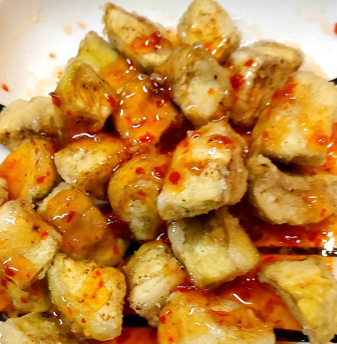 Помните, с каким восторгом я рассказывала вам о закуске из баклажанов, которую отведала в своей прошлой поездке в одном из ресторанов Бишкека? Я их приготовила дома! У меня получились такие же нежные, с хрустящей корочкой - великолепнейшие! Понадобится: - Баклажаны – 3 шт средних - Соль и сухой чеснок – по вкусу - Крахмал картофельный для обваливания баклажанов - Растительное масло для жарки Кисло-сладкий соус: Можно взять готовый соус или приготовить самостоятельно, для этого понадобятся: - Лимонный сок – 40 г (можно заменить яблочным 6% уксусом) - Сахар – 50 г - Вода ~ 80 - 100 г - Соевый соус – 60 г - Кетчуп – 1 ст.л. - Крахмал – 2-3 ч.л. Готовим: Сначала соус: Смешиваем все ингредиенты и варим, постоянно помешивая, до загустения. Остывший соус станет еще гуще. Я соус приготовила, но прежде, чтоб подстраховаться, купила вот такой готовый - он очень подходит: Теперь готовим баклажаны: Сначала очищаем их от кожуры, затем нарезаем кубиками, со сторонами размером примерно по 2