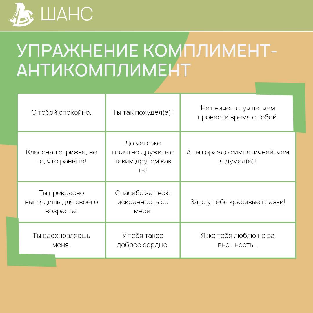 Мы говорим с участниками тренингов о том, что “правильные” комплименты, которые приятно получать, должны быть основаны на достижениях и качествах человека, а не на его поле, расе, других гендерных или культурных признаках. Учимся ценить и уважать каждого человека за его уникальные качества, проявления и достижения».