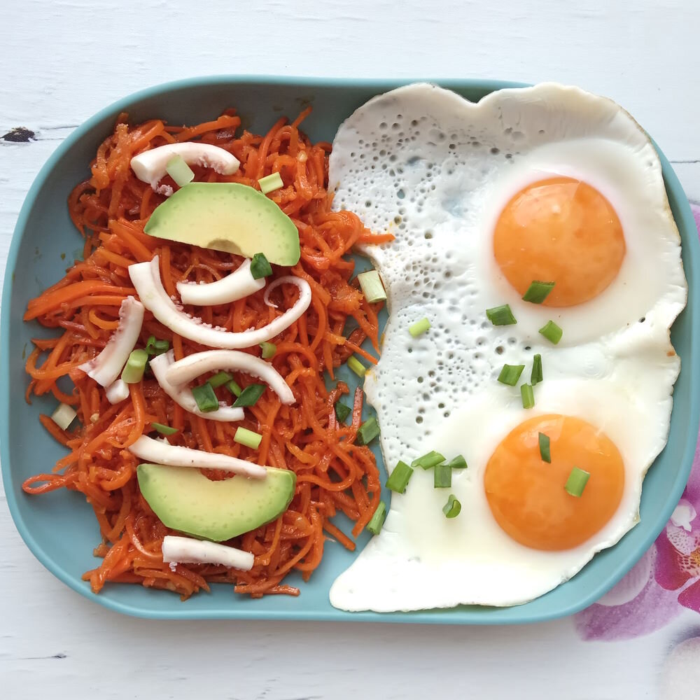КБЖУ 392/31/23/14 ★ Готовим яичницу из 2 яиц. ★ Варим кальмаров 85 гр 5 минут. ★ Морковь по-корейски 150 гр. ★ Авокадо 30 гр. Больше готовых меню вы найдете в моем Телеграм канале https://t.me/d_sigal и в группе Вконтакте https://vk.com/pp_sigal