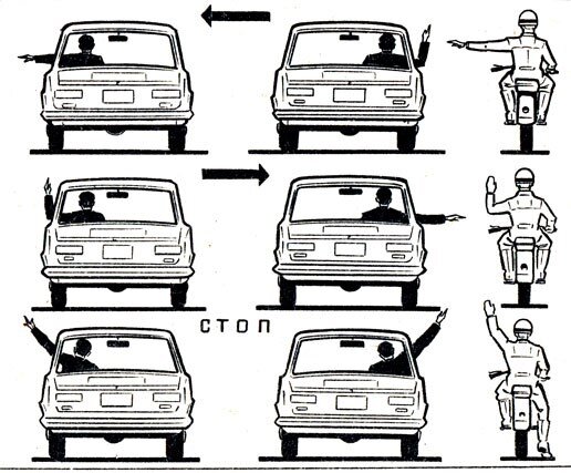 Ситуации на дорогах возникают разные, нередко нужно сообщить другим участникам движения о проблеме или предупредить об опасности. На практике используется ряд сигналов и жестов, позволяющих обозначить какое-либо действие, наличие препятствия и тому подобное. Использование рук Поднятие водителем одной ладони свидетельствует о благодарности или приветствии, скрещенные руки предупреждают о большом заторе. На плохо закрытую дверь или багажник просто указывают жестом, либо осуществляют хлопок по воздуху. Схематическое изображение мерцания лампочки подсказывает, что нужно включить фары. Провод руки в направлении обочины обозначает наличие какой-либо неисправности, заметной со стороны. Следует остановиться и выяснить причину. Сигналы световыми элементами Фары для общения используют следующим образом: Применение указателей поворотов и стоп-сигналов Многотонные грузовики преимущественно движутся в первом-втором ряду. Если фура сигналит левым указателем поворота, но не собирается перестраиваться