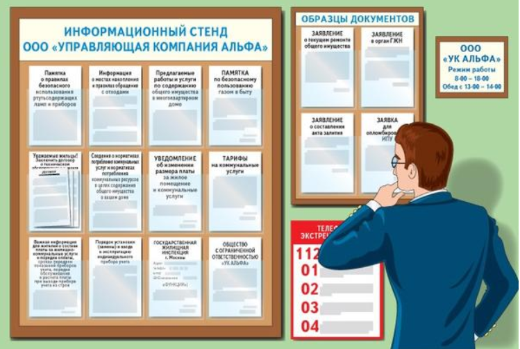 Недавно мы рассказали, какая информация должна быть обязательно размещена на информационных стендах в ваших МОПах. Теперь публикуем, что такое представительство УК и какая информация должна располагаться на инфостендах в представительстве? Представительство управляющей организации (офис УК на объекте) предназначено для приема жителей, предоставления оперативных ответов на поступающие вопросы, а также оказания любой другой помощи собственнику или пользователю помещения в многоквартирном доме по возникающему у него вопросу, связанному с управлением домом. Офис УК должен располагаться в пределах муниципального образования на расстоянии не более 3 километров в пешей доступности. На инфостенде должно быть размещено: 1. наименование (фирменное наименование) управляющей организации, номер лицензии, срок действия лицензии, информация об органе, выдавшем указанную лицензию, адрес местонахождения, в том числе представительства управляющей организации, режим работы, информация о днях и часах пр