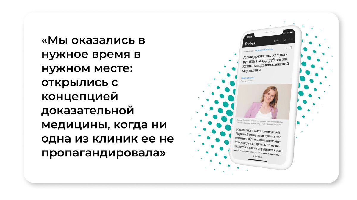 Хорошо понимая потребности молодых мам и имея представление о том, как должна выглядеть современная медицина, Марина Демидова решила запустить свой бизнес — частную детскую клинику, пропагандирующую доказательный подход. За четыре года проект разросся до сети из нескольких клиник, привлек более полумиллиарда рублей и вышел на миллиардную выручку.