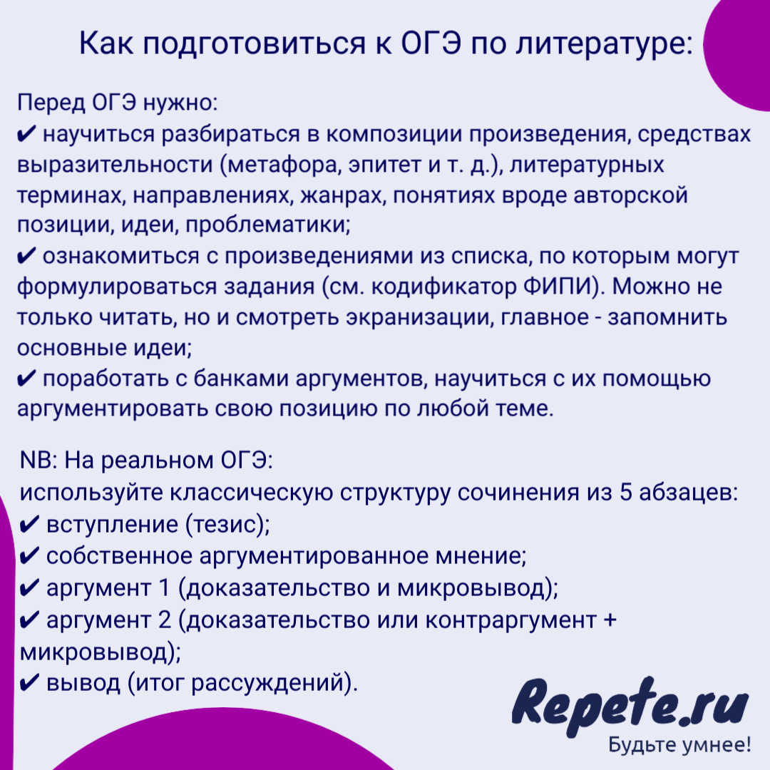 Рассказываем про ОГЭ по литературе и дарим ссылку на тест-тренажёр по средствам выразительности. Максимально за этот экзамен можно получить 42 балла. Состоит он из двух частей и длится 235 минут, из которых 120 минут рекомендовано выделить на выполнение первой части, а оставшееся время – на сочинение. Ни в одном из заданий не обойтись кратким ответом, потребуется развернутое рассуждение и анализ текста, так что рассчитывать на удачу не приходится. 1 часть состоит из 4 заданий. Потребуется знание произведений и умение анализировать тексты, нужно выбрать один из двух вопросов. Первые три задания «весят» по 6 баллов, четвертое – задание повышенной сложности и оценивается в 8 баллов. 2 часть состоит из одного задания, но это объемное сочинение (не менее 200 слов) из предложенных на выбор 5 тем. Сочинение оценивается по пяти критериям – «зачет»/«незачет». Первые два критерия самые важные, «незачет» по ним означает, что экзамен не сдан. Чтобы получить «зачет» за сочинение в ц