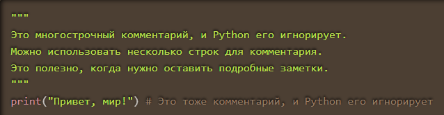 Комментарии — это текст, который написан внутри кода программы, но который Python игнорирует при выполнении программы. Они нужны, чтобы делать пояснения к коду и оставлять заметки для других разработчиков или для себя на будущее. Чтобы создать однострочный комментарий в Python, нужно поставить символ # перед текстом комментария. Компьютер будет игнорировать все, что идет после символа # на этой строке. Например: # Это комментарий, и Python его игнорирует print("Привет, мир!") # Это тоже комментарий, и Python его игнорирует Чтобы создать многострочный комментарий в Python, нужно использовать тройные кавычки в начале и в конце комментария. Все, что идет между этими кавычками, будет проигнорировано при выполнении программы. Например: """